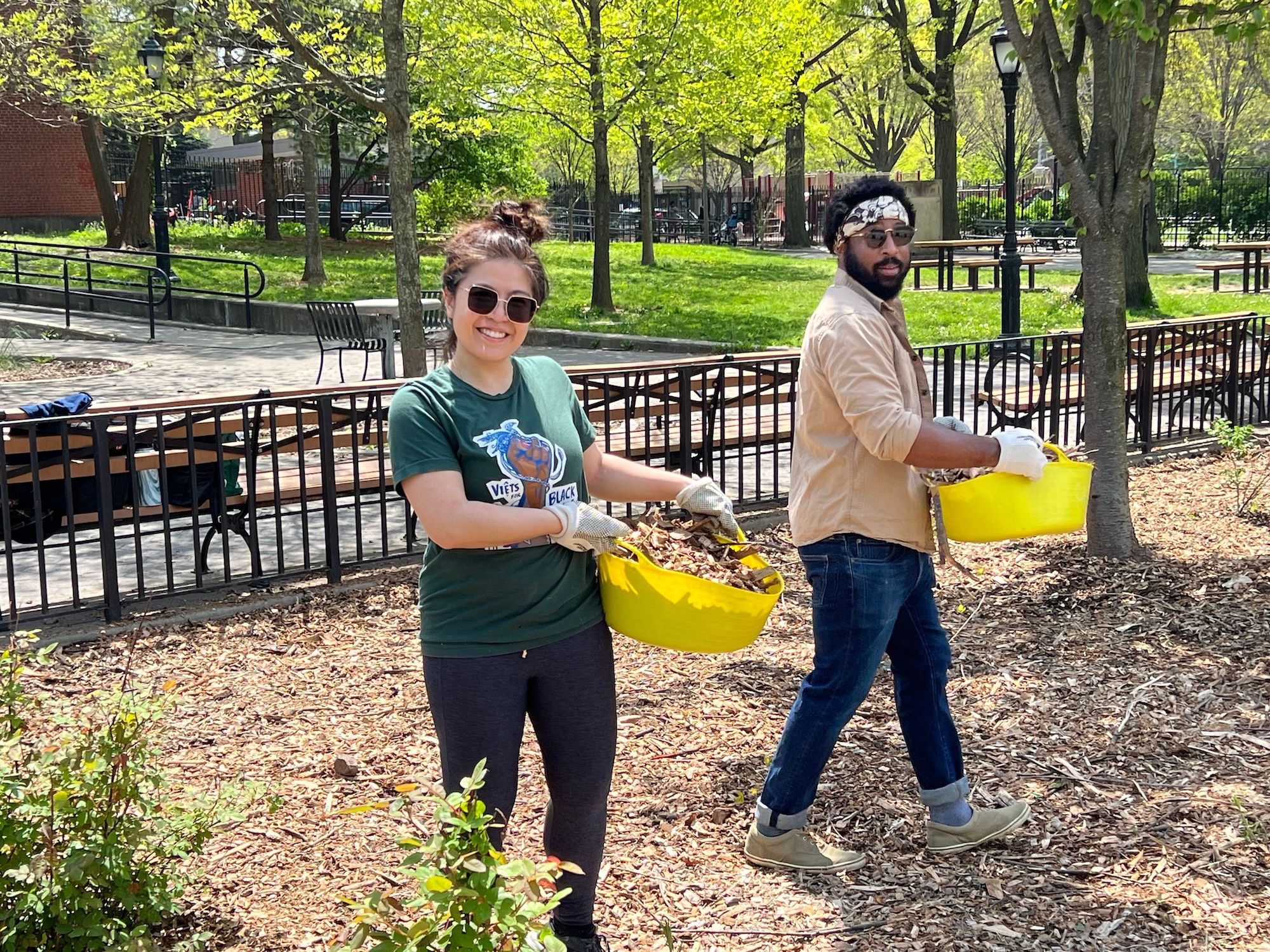 Carolina Đỗ and Ben Holbrook mulching St. John's Park